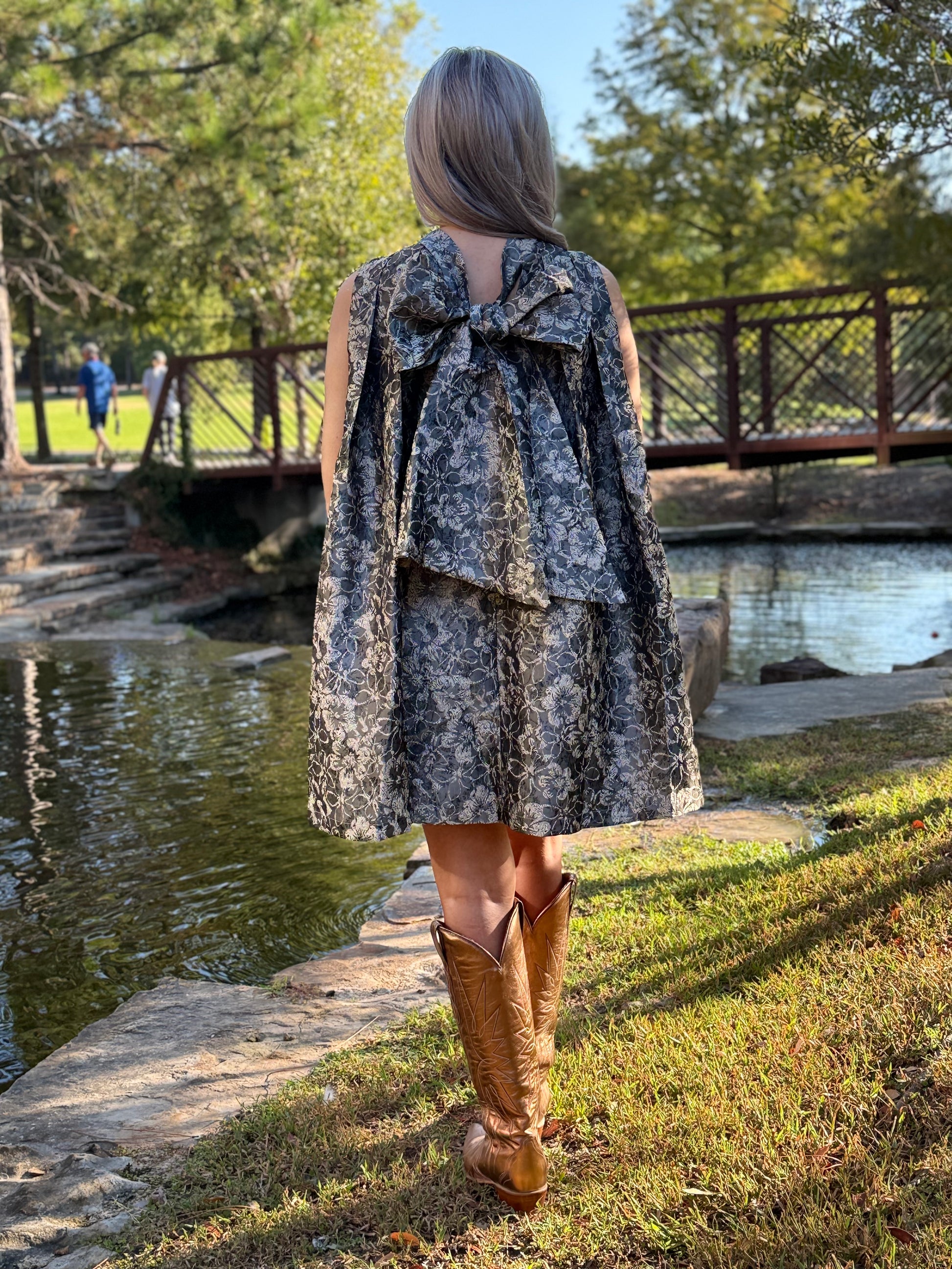 Bring the sparkle to every celebration in the Champagne Holiday Dress. Designed with a shimmering jacquard floral print and finished with a dramatic oversized bow, this statement mini is made for festive nights out. The swing silhouette flatters effortlessly while the metallic finish catches the light, making it the perfect piece for holiday parties, weddings, and New Year’s Eve. A true showstopper for the season.