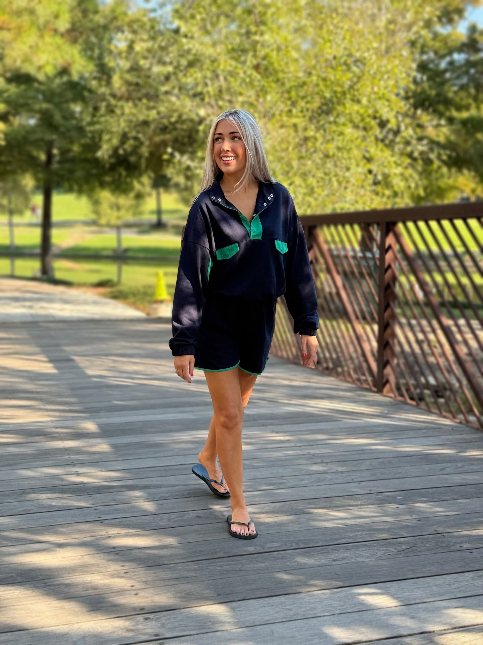 The Cozy Color Block Set blends sporty style with laid-back comfort, making it a must-have for your casual-chic wardrobe. Featuring a collared pullover top with bold snap-button details and matching elastic-waist shorts, this two-piece set is all about effortless style. The navy base with striking green accents gives it a preppy, playful edge, while the relaxed fit keeps it comfortable for all-day wear.