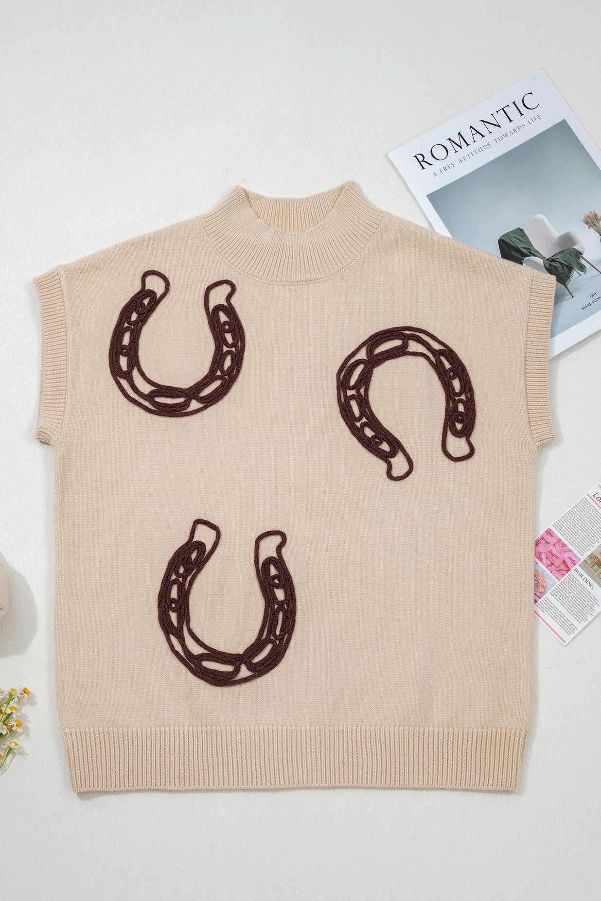 Add a little Western charm to your wardrobe with the Rodeo Round Up Sweater Vest. This cozy neutral knit features bold horseshoe embroidery that brings a fun, rustic touch to a timeless silhouette. Designed with a soft beige base and rich brown detailing, it’s the perfect blend of classic and cowgirl.