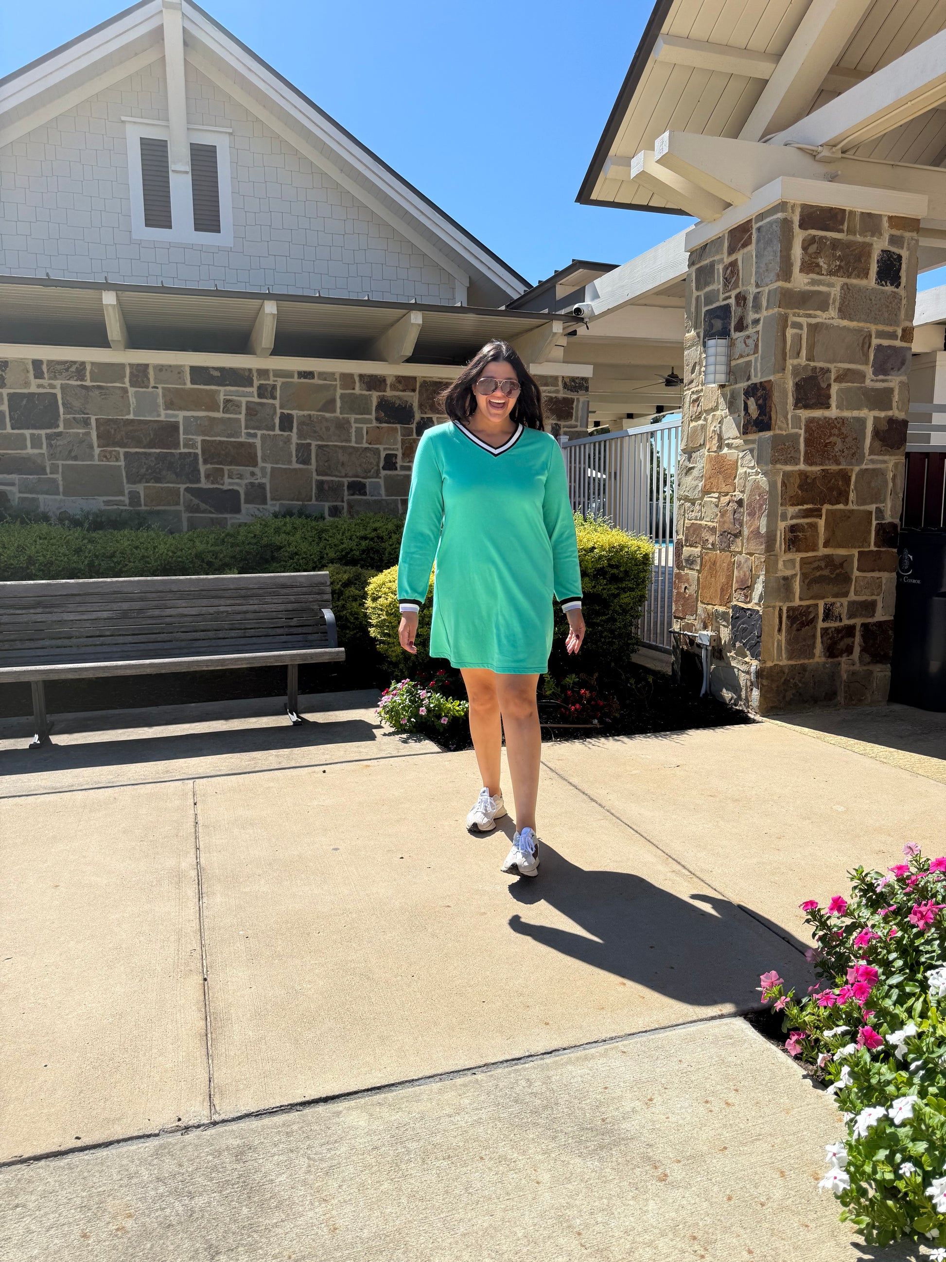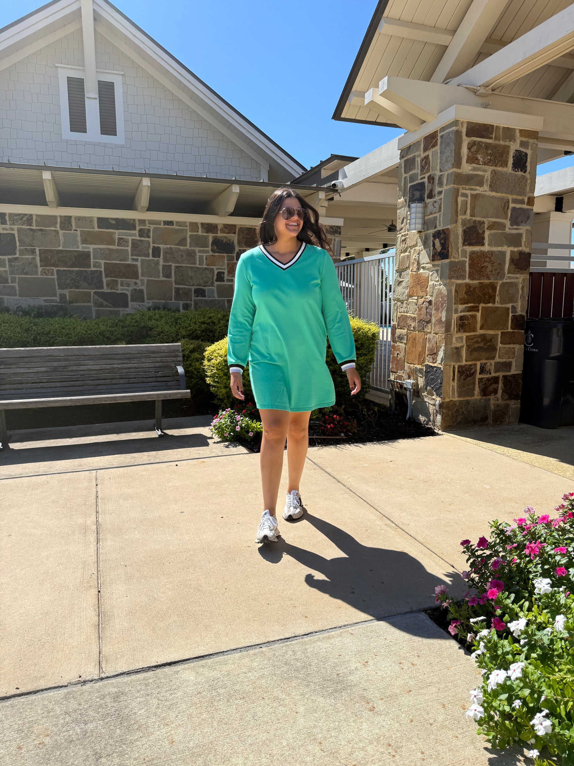 Bring sporty-chic style to your everyday look with The Varsity Dress. Featuring a bold green color with classic striped trim at the neckline and cuffs, this dress is perfect for game days, casual weekends, or running errands in style. The long sleeves and easy shift silhouette make it comfy and versatile, while side pockets add that extra touch we all love.